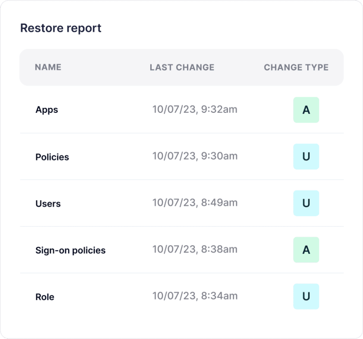 Real-time tracking of all changes to Okta configurations. Get notified about critical updates and potential threats. Access a full change history with the ability to quickly restore previous versions.